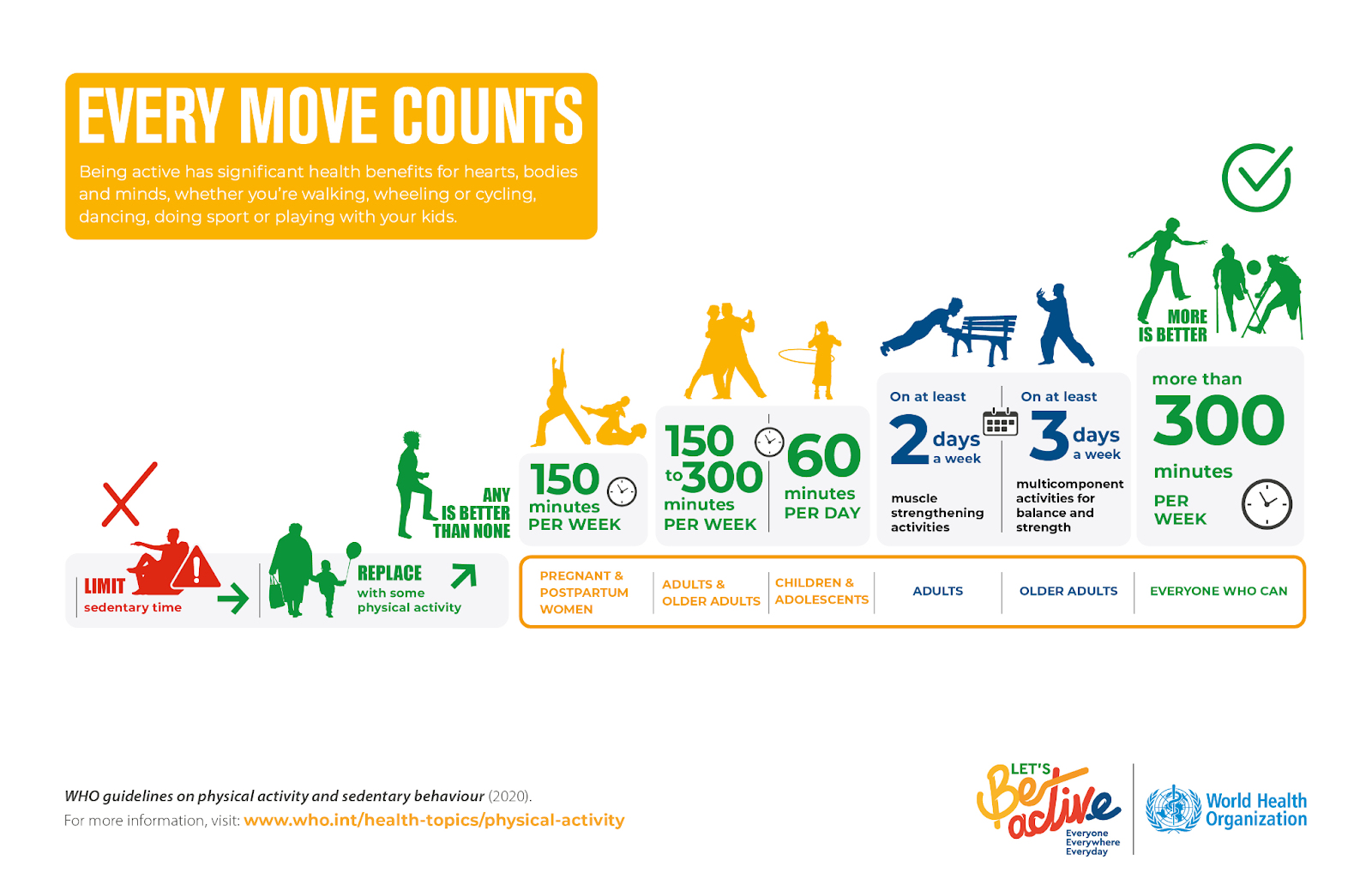 Encourage at least moderate activity, ideally aiming for daily movement per WHO guidelines.