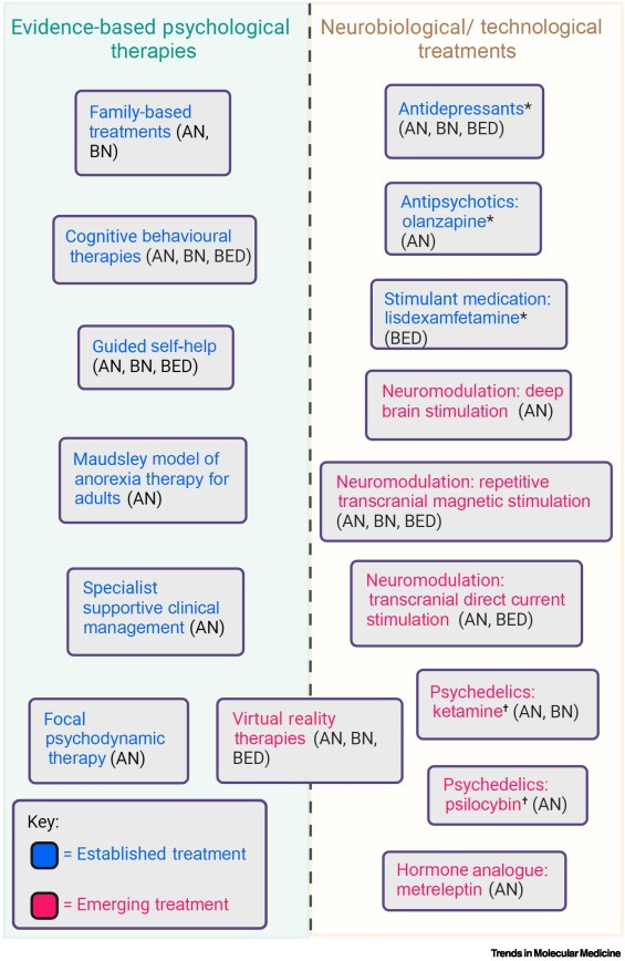 Treatment typically combines psychological interventions and medical support. For adolescents, family-based treatment is often first-line. For adults, the following outpatient therapies are available: